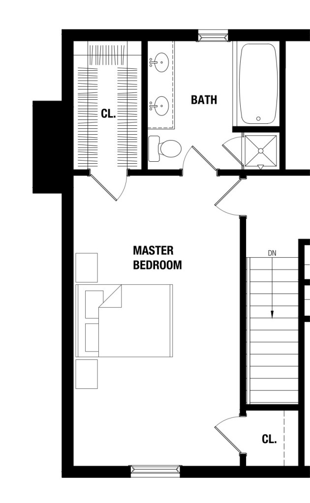 This option switches the location of my current bathroom and closet. The window that is currently in my bath stays so the closet has a window, and then a new window of the same size is added to the new bath location. The bath extends 5′-6″ into my bedroom, but that still leaves enough space for the bed wall (which would become 14′-7″ long).