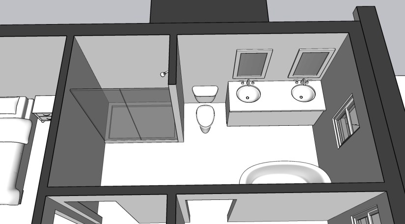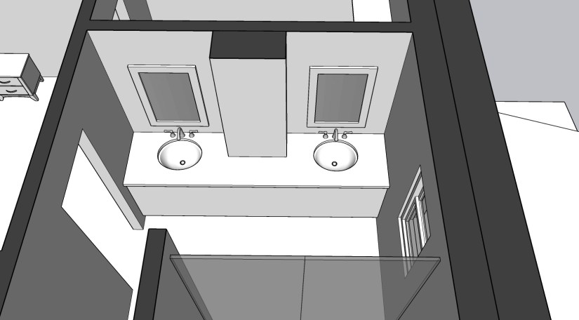 This leaves a whole wall that could be taken up with the vanity making it extra long (almost 9′-0″ long). There could even be a storage cabinet between the sinks.