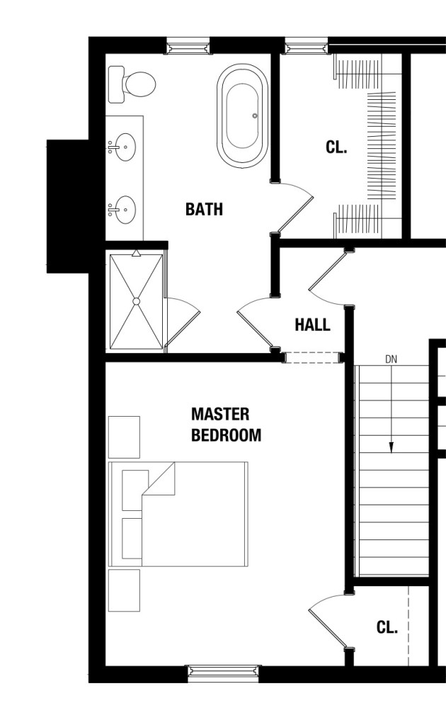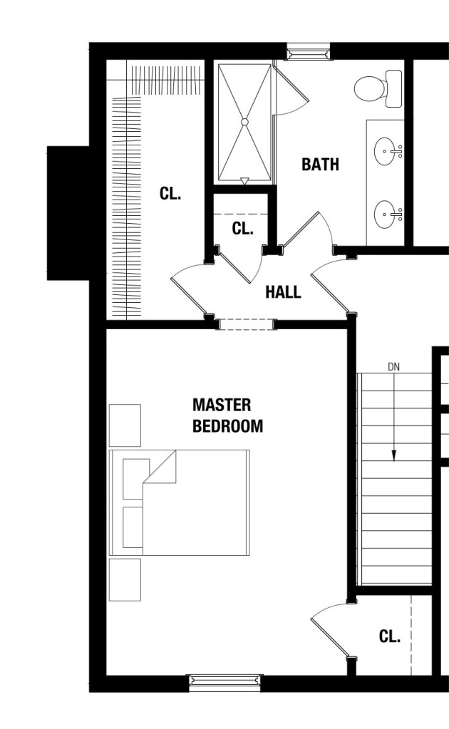 The expansion into the bedroom space provides the closet with 3′-6″ more in hanging space and also gets the closet door into a better position. The hall that is created when you come inside the bedroom also helps to give more sound privacy to the bedroom. The hall could be used to access a linen closet since the bathroom vanity is not as long in this option as Option 1.