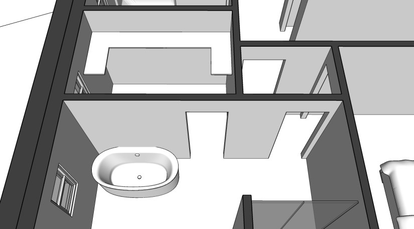 In place of my current closet and bathroom, there would be two separate walk-in closets with a hall in the middle leading to the new bathroom.
